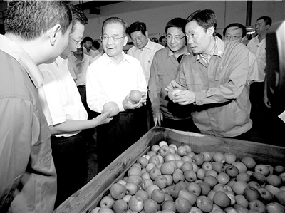 温家宝向企业负责人详细询问苹果出口情况。新华社记者樊如钧摄