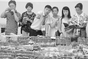 7月16日,参展人员在大连夏季房交会上向市民推介楼盘 资料图