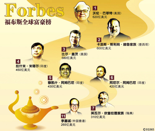 福布斯今年富豪榜单冠亚季军排名与去年相仿,依旧是墨西哥的卡洛斯斯利姆、美国的比尔盖茨和巴菲特,三者身家依次为740亿、560亿、500亿美元。
