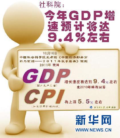 中国社会科学院10日发布的《中国经济形势分析与预测——2011年秋季报告》预计,2011年我国GDP增长速度将达到9.4%左右,比2010年略有回落,居民消费价格指数全年将上涨5.5%左右。