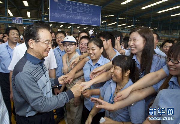 10月13日至14日,中共中央政治局常委、国务院总理温家宝在出席第110届广交会开幕式期间,就经济形势尤其是当前外贸企业情况进行调研。这是10月14日,温家宝在广州大阳摩托车有限公司亲切看望企业职工。 新华社记者 李学仁 摄