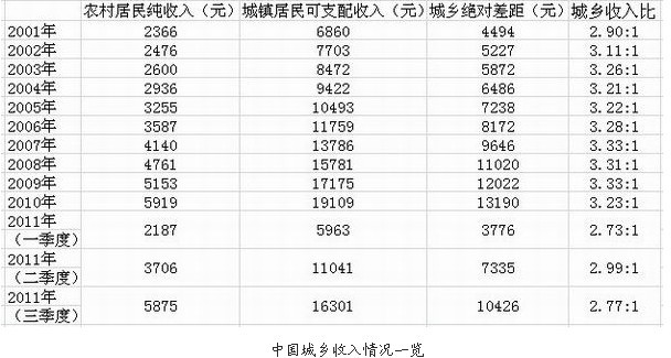 早在2005年,国际劳工组织的数据显示,绝大多数国家的城乡人均收入比都小于1.6,只有三个国家超过了2,中国名列其中。而美、英等西方发达国家的城乡收入差距一般是在1.5左右。到了2010年,根据中国社会科学院城市发展与环境研究所发布的《中国城市发展报告No.4——聚焦民生》显示,我国城乡收入差距比为3.23:1,成为世界上城乡收入差距最大的国家之一。