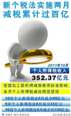 新华网电(记者何雨欣、崔清新)记者16日从财政部获悉,今年10月,个人所得税收入352.37亿元。受提高工薪所得减除费用标准影响,本月个人所得税减收明显显现。