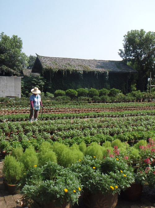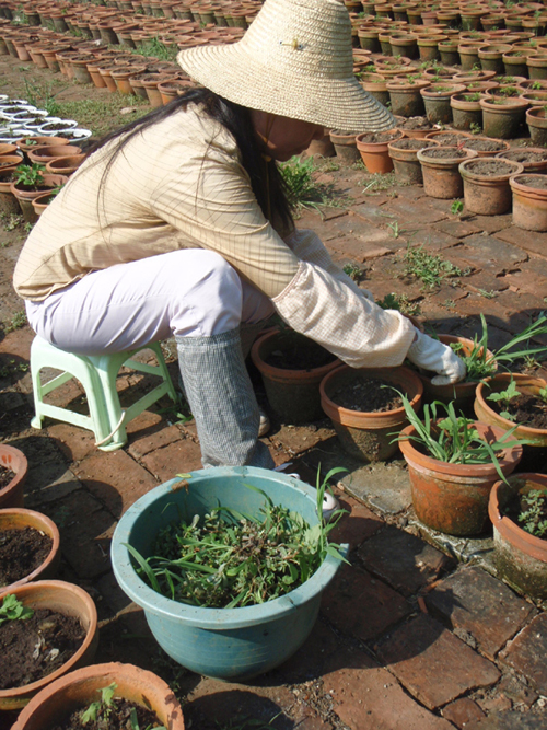 物业部绿化科工作人员在民族村花房对盆栽进行维护,清除杂草