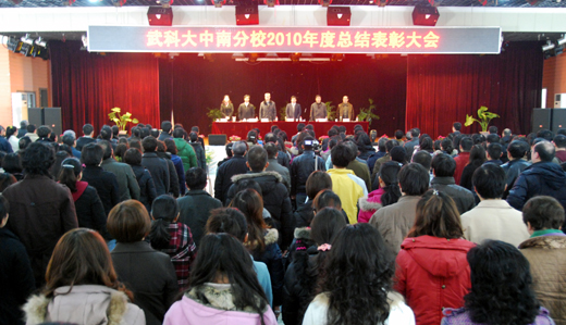 本网讯(记者 成实 报道)汤逊湖和风渐劲精神爽,梅南山欢歌笑语宏图展。3月4日下午,武汉科技大学中南分校2010年度总结表彰大会在大学生活动中心三楼隆重举行。广信科教集团有限公司董事局主席、董事长,中南分校校长赵作斌教授及郑鹏飞、王元璋、吴开胜、吕家燕、肖坤等校领导出席会议并在主席台前排就座。全校各处、室、馆、所负责人和全体教职工参加会议。会议由校党委书记郑鹏飞主持。