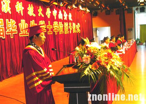 在庄严的国歌声中,学士学位授予仪式拉开了序幕。顾杰教授首先致辞,她寄语毕业生们大展宏图,在人生的道路上勇往直前,为母校添光增彩。常务副校长王元璋教授宣读了2011届优秀毕业生名单,副校长吴开胜教授宣读了2011届学生毕业及学位授予文件。浓浓离别意,深深母校情,毕业生代表王曼丽在典礼上作深情发言。随后,校长赵作斌教授发表了热情洋溢的讲话,为2011届毕业生上毕业前的最后一课。他希望广大毕业生们谨记“笃志、博学、崇实、拓新”的八字校训,敢于吃苦,善于吃亏,终身学习,提升自我,脚踏实地地开启成功之门。赵校长表示,校友们走向社会遇到困难时,可以随时到学校来寻求帮助,母校永远是校友们温馨的港湾,欢迎常回来做客。赵校长的谆谆教导让毕业生们受益匪浅也感动不已,不时引起一阵阵掌声。