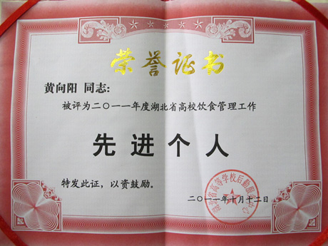 一食堂经理黄向阳被评为省高校饮食管理工作先进个人