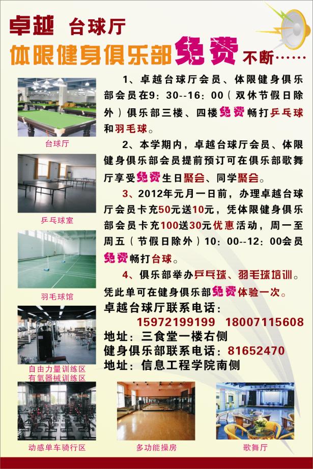 记者了解到,凡是办理了卓越台球厅和体限健身俱乐部会员卡的师生在9:30——16:00(双休节假日除外)俱乐部三楼、四楼可免费畅打乒乓球和羽毛球,俱乐部还将举办乒乓球、羽毛球培训。同时,在本学期内,会员们通过提前预订可在俱乐部歌舞厅享受免费生日聚会、同学聚会。2012年1月1日前,办理卓越台球厅会员卡充50元送10元,凭体限健身俱乐部会员卡充100送30元优惠活动,周一至周五(节假日除外)10:00——12:00会员免费畅打台球。