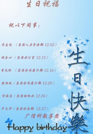“广信科教集团有限公司全体同事祝您生日快乐!” 在集团总部行政楼的公告栏旁边,醒目的“生日祝福”展板吸引了广大员工的目光,即将过生日的员工也纷纷得到了大家的祝福。为职工专门开辟网站栏目,制作祝福展板是集团公司为把握全公司员工思想脉搏,在日常工作生活中关心了解员工,营造以人为本的和谐工作环境而采取的又一新举措。