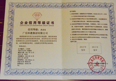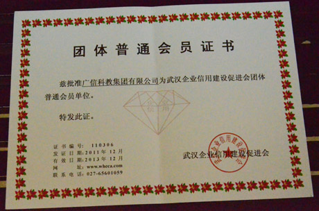 本网讯(记者 鲁信 报道)岁末又逢春,喜讯频传来。12月27日上午,第七次武汉市信用企业授牌大会暨武汉企业信用建设促进会第四次动员大会在中共武汉市委会议中心隆重举行。会上,广信科教集团有限公司有限公司荣获2011年度“武汉市信用企业”称号,被授予“武汉市信用企业”奖牌、“企业信用自律体系建设优胜单位”荣誉证书以及“企业信用AAA等级证书”,同时被武汉企业信用建设促进会批准为武汉企业信用建设促进会团体普通会员单位。