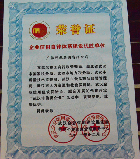 评选在企业自查、自测、自改、自评基础上,通过自愿申报,由武汉企业信用管理服务中心进行严格的财务测评、核查访谈、专家初审,在《长江日报》上公示和向有关政府部门征信等程序。最终,经过严格的评选,经武汉企业信用自律体系建设评审委员会审核决定,授予广信科教集团有限公司有限公司等392家企业为2011年度武汉市信用企业。获奖企业将享受到市政府出台的各项优惠政策待遇,并为之建立信用企业档案。