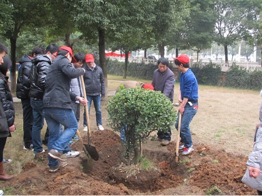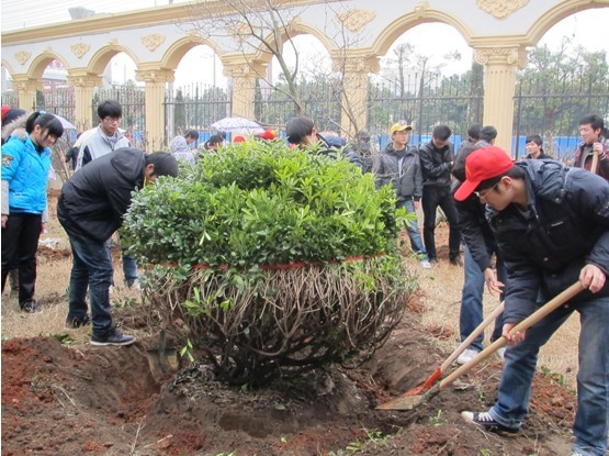 下午1时30分,后勤环艺部工作人员带领志愿者们来到指定的植树场地,大家分好组,井然有序的忙碌着,根据树木种植规划,先把树苗挖出,然后移栽到事先挖好的树坑里,最后盖土、浇水。同学们干劲十足,当时天空还下着小雨,但已经不能阻挡同学们植树的热情。期间,环艺部人员耐心为同学们进行技术指导,及时解决困难,保证移栽树木的成活率。种摘完,各班同学还为各自移栽的树木挂牌命名,如:“百年树木,永远的1108”、“爱我校园,绿色环保”、“未来美好环境的缔造者”。看到一株株已扎根厚土,笔直挺立在雨露下的树苗,同学们的心凝聚到了一起。