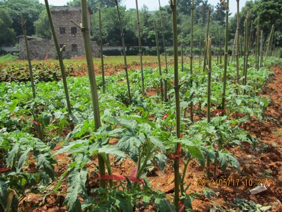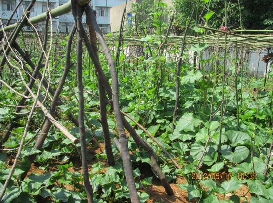 走入民族村,景色宜人,在蔬菜种植基地,一垄垄蔬菜青翠欲滴,西红柿、黄瓜长势喜人,瓜果蔬菜勃勃生长的态势更是增添了一份景致。蔬菜园是园里的隙地开辟的,共有二处,地形长方,面积大小不等,阳光充足,临湖掘起,土壤经过改良后是最适于种菜的地方。目前,蔬菜园里种植的黄瓜、苦瓜、瓠子旁已架起了支架,藤蔓也已爬上了支架,透过枝叶可以看到结出的带刺小黄瓜;茄子、番茄树旁也立起了小竹竿,这些竹竿将菜苗紧紧的固定住,等待着果实的成长;绿中透红的苋菜已长高,翠绿的空心菜也已成熟,可以摘下食用了,其他的瓜果蔬菜预计在六月份便可成熟。