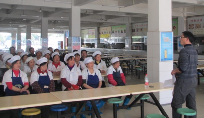 会上,孙经理从服务意识、服务技能、服务规范、岗位职责对员工进行了培训,着重在服务态度、服务语言、行为规范及工作范围等要求与流程上进行了详细讲解,并由培训人员现场实操练习。由于食堂保洁员工文化层次差异大,年龄也偏高,接受慢,但大家虚心学习,互比互赶,形成了良好的工作氛围。