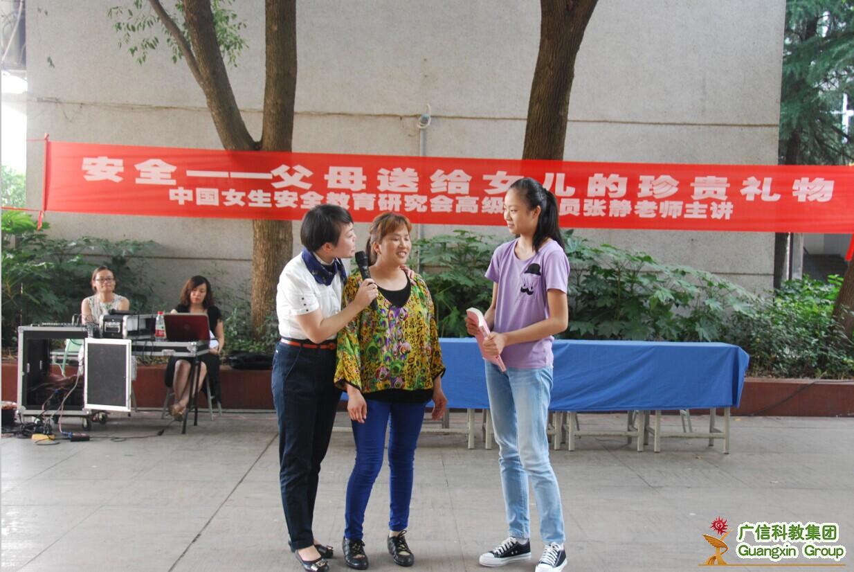 在演讲过程中,张老师不仅运用了很多重点事例如:“网恋”、“早恋”、“出行安全”、“紧急对策”等女学生生活中必不可少的生动案例,同时也引用了一些适合15、6岁女儿心理的时髦词语,打消了一些女生青春期的叛逆情绪。在场的女生们时而踊跃回答问题互动,时而陷入沉思冥想,时而莞尔一笑的开心,时而闭目陷入沉思。最可贵的是在场的家长,也积极地参与到此次活动中,有的甚至拿出纸笔记好笔记。
