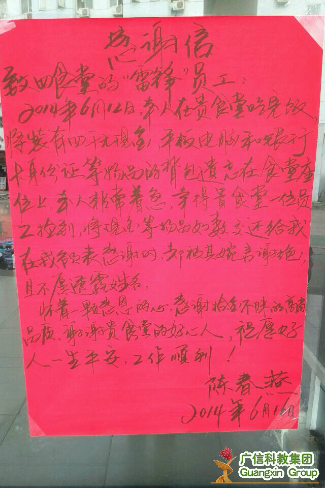 本网讯(通讯员 李江涛 鲁信 报道)“怀着一颗感恩的心,感谢拾金不昧的高尚品质,谢谢贵食堂的好心人,祝愿好人一生平安……”昨日上午,后勤公司四食堂门口一封“致后勤公司雷锋员工”的感谢信,引众人围观,看过的人纷纷点赞。记者了解到,写信的是武昌理工学院生命科学学院的陈春燕老师,她在感谢信中介绍说,前几日在食堂饭吃完饭,将装有四千元现金、平板电脑和银行卡身份证等物品的背包遗忘在食堂座位上,当时非常着急,幸得一位好心食堂员工捡到,并主动归还了物品,让她感动不已。