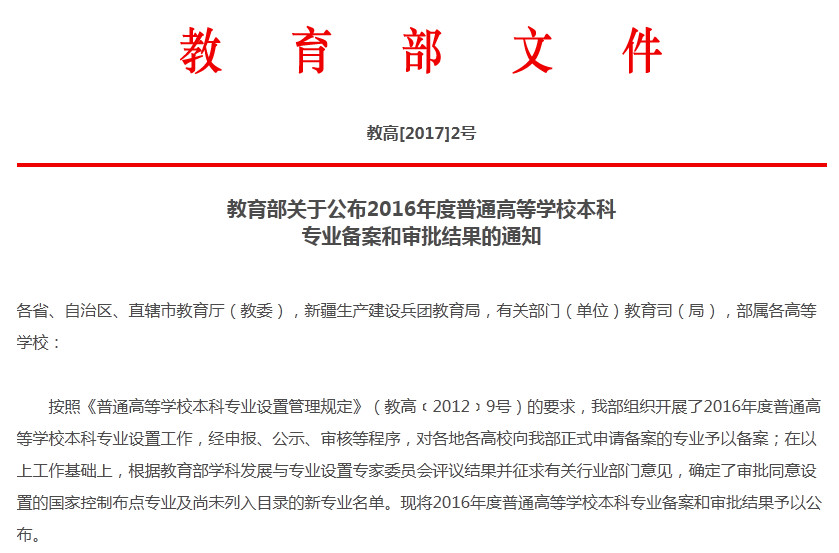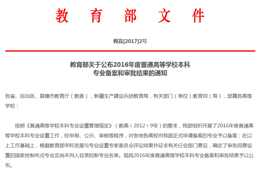 按照《普通高等学校本科专业设置管理规定》(教高﹝2012﹞9号)的要求,教育部组织开展了2016年度普通高等学校本科专业设置工作,经申报、公示、审核等程序,对各地各高校向教育部正式申请备案的专业予以备案。