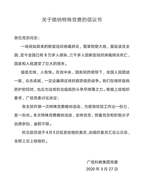 心手相连,守望相助。3月27日,广信科教集团党委在党中央及上级党组织的号召下发布了《关于缴纳特殊党费的倡议书》,得到集团上下党员干部积极响应。